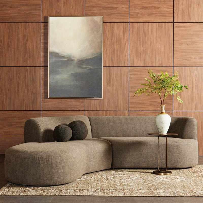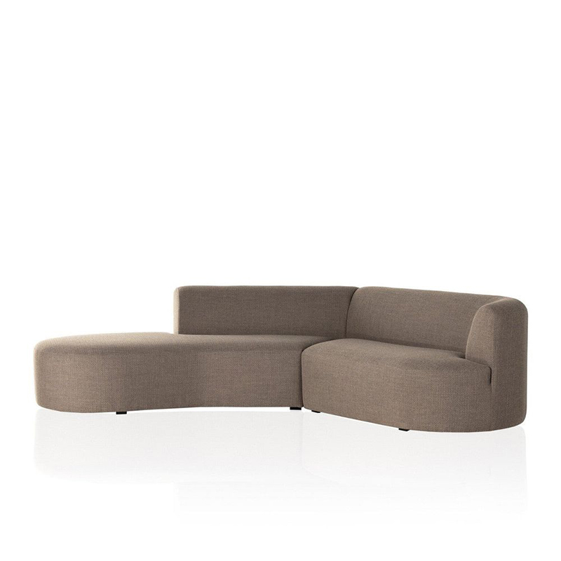 The sofa is upholstered in a tactile, textured fabric—likely a boucle or similar material—that is soft to the touch and adds a layer of warmth and sophistication to any room. Its low-profile design and rounded edges contribute to a streamlined, contemporary aesthetic. Whether you’re entertaining guests or enjoying a quiet evening, the Curvo sectional provides a spacious and comfortable setting, making it the perfect focal point for your living room or family room.