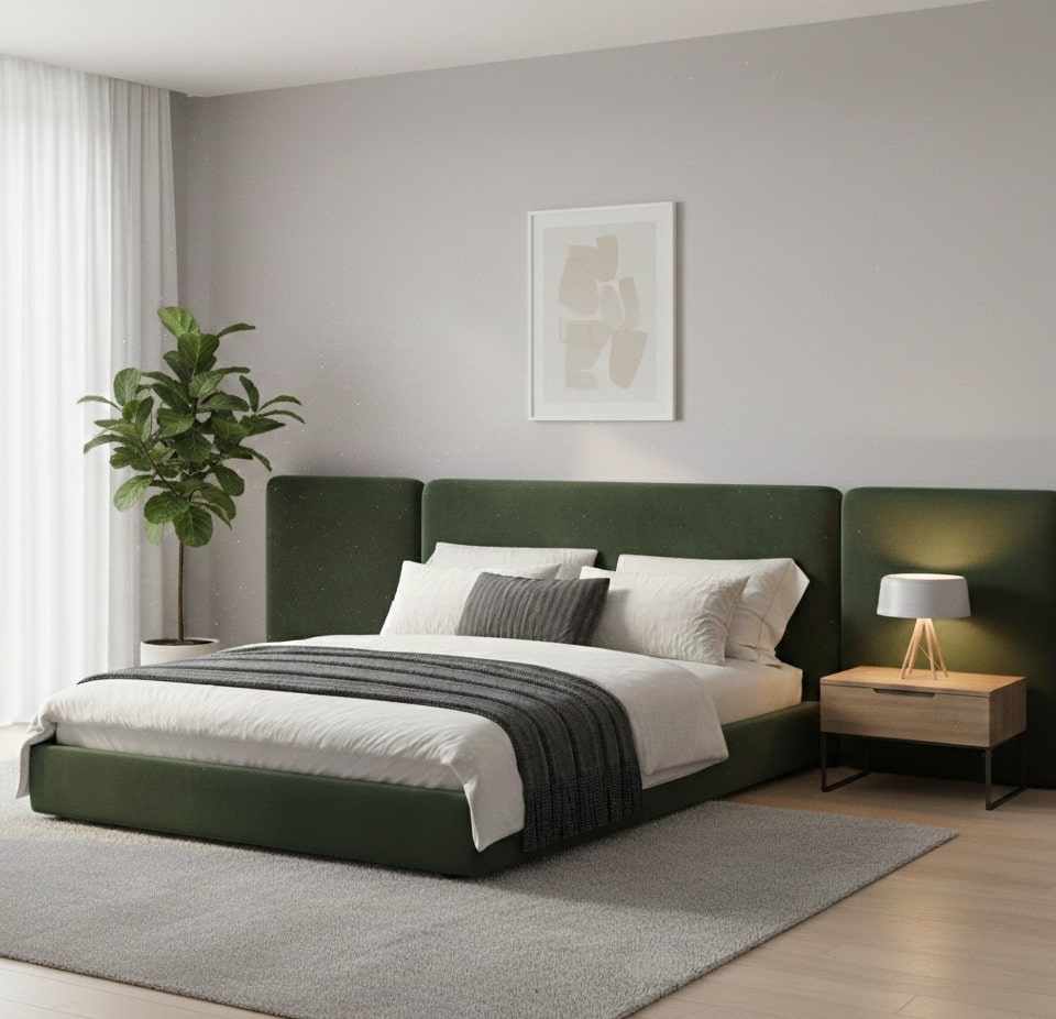 The structured headboard panels provide both comfort and support, making it ideal for relaxing, reading, or unwinding in bed. Upholstered in a smooth premium finish, the headboard offers a soft and inviting texture while enhancing the overall luxury appeal of the bedroom.